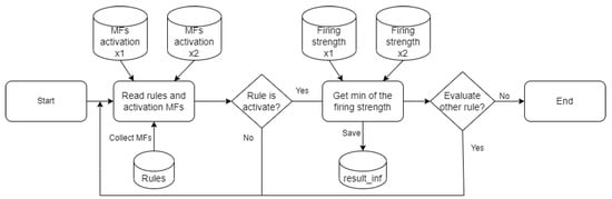 Inference: In this stage, the rules of the FIS are evaluated. Through a loop, each MF is evaluated and compared to define which MF is activated for the input of the FIS. Then the firing strength is activated, and all the firing strengths are compared to compute the min method (see Equation (4)). The result is saved in a register called result_inf. When the evaluation of the rules is finished, a variable is activated to indicate that the next stage is ready to start. Figure 8 shows the diagram of the process.