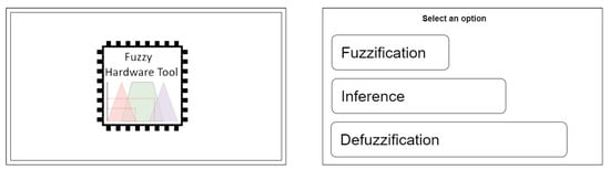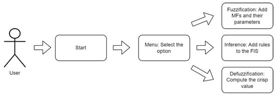 This section explains the graphic interface that the user uses to manage the FIS. To explain the main functionality of the GUI, a Unified Modeling Language (UML) diagram is shown in Figure 9. A user starts the FIS and the first screen shows the tool logo. This screen is just to provide a welcome. When the user touches the screen, it changes to the second screen, which is the menu. In this screen, the user selects an option to interact with the FIS, as shown in Figure 10. Because the FIS has three stages, the menu screen has three options. The first option is Fuzzification, the second option is Inference, and the last option is Defuzzification.
