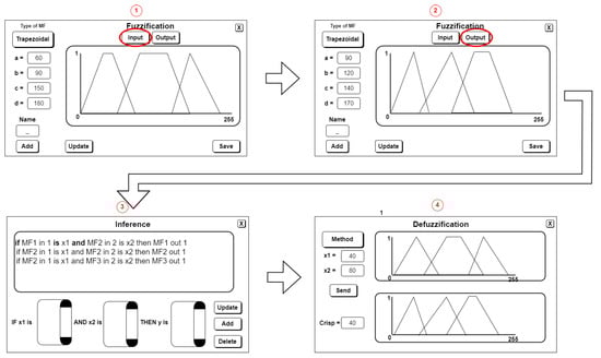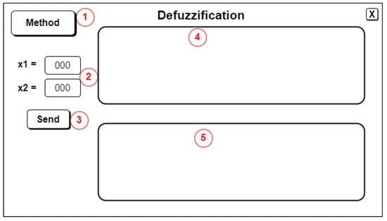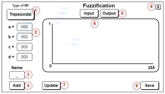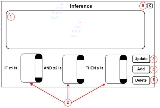The next screen is the Inference stage. The interface is divided into six options, as shown in Figure 13. (1) Shows the rules when the user adds them. This is called the inference display. In this part, the user can create fuzzy rules with the data from the previous stage denoted by option (2); (3) this option is to add the rule to the inference display; (4) and (5) allow the user to update or delete rules; and (6), when the user finishes adding rules, they can use the button X in the corner of the screen and return to the main menu.