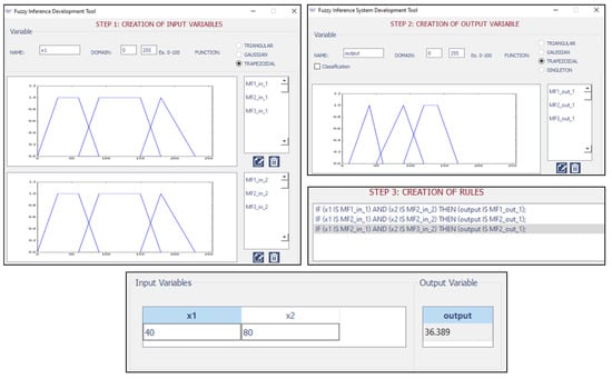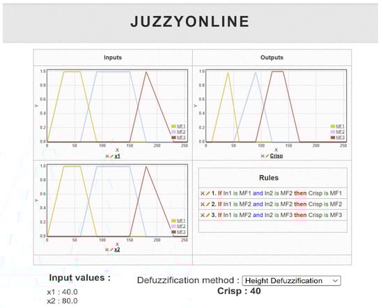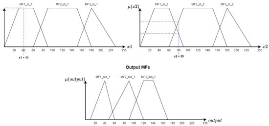 For the experiment, an FIS was proposed with the following characteristics: three MFs (two trapezoidal MFs and one triangular MF) for each input and three MFs (two triangular MFs and one trapezoidal MF) output. The parameters of the MFs are in Table 3 and the MFs are shown in Figure 16. The FIS also has three fuzzy rules, as shown in Equation (6); and finally, to compute the crisp, the input values are x1 = 40 and x2 = 80.
