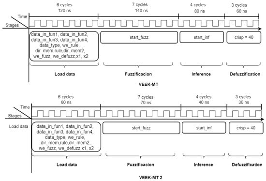 After completing the process using the Fuzzy Hardware Tool, the simulation was performed on the VEEK-MT and VEEK-MT2 SoCs. Figure 18 illustrates the timing of the FIS and the number of clock cycles required for each step. In this case, the FIS takes six cycles to capture the data, seven cycles for the fuzzification stage, then four cycles for the inference stage, and finally three cycles for the defuzzification stage. The figure also shows that the crisp is calculated at 400 nS for VEEK-MT and 200 nS for VEEK-MT2, due to the clock oscillators of each SoC (see Table 2).