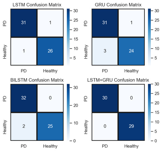 | LSTM+GRU | PD | 0.95 | 1.00 | 0.71 | 0.83 | 1.00 | 1.00 | 1.00 | 1.00 |