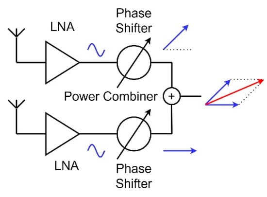 Receiver block diagram for two radiating elements. Directly after being amplified by an LNA, the desired phase shift is introduced into the signal. Subsequently, a power combiner combines the signals from different paths.