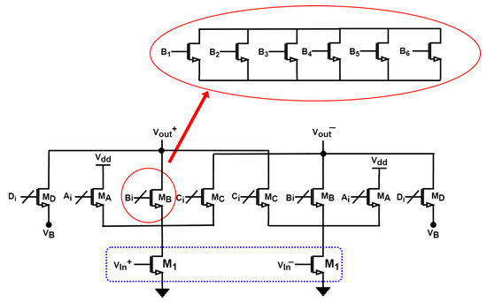 Topology of the VGA composed of common gate transistors (MA, MB, MC and MD) and the intermediate stage (marked with blue) composed of common source transistors (M1). The MA transistors are the input dummies, and the MD transistors are the output dummies.