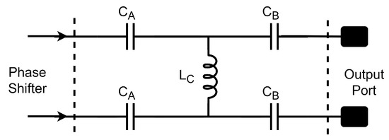 An iterative approach was carried out, focusing on the following specifications: low RMS errors in phase and gain, low variations in output and input impedances between different configurations and low power consumption. The values chosen for the different elements of the circuit are as follows: L0 = 260 pH (Q = 21.0 @ 19.5 GHz) and C0 = 330 fF. The size of the VGA transistors is W/L = 2 μm/60 nm, while the size of the transistors that conform to the intermediate stage is W/L = 16 μm/60 nm. To achieve the desired polarization of the transistors, the DC voltage at the input has to be set to 800 mV, and VB has to be 372 mV. Because the next stage after the phase shifter is a power combiner whose input impedance is capacitive (Cgs of a NMOS transistor), when the phase shifter and power combiner are integrated on-chip, it will not be necessary to include an output impedance-matching network. However, to measure the behavior of the phase shifter, it is necessary to adapt its output impedance to 50 Ω. Considering this, the output matching network shown in Figure 4 was used in the simulation, where CA = 180 fF, CB = 70 fF and LC = 675 pH (Q = 11.2 @ 19.5 GHz).