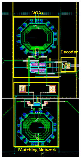 Figure 5 shows the layout of the beamformer core, which occupies an active area of 0.1 mm2. It can be seen that the more critical elements for the occupied area are the inductors, followed by the capacitors. It was very important to maintain the symmetry between the I/Q paths in order to avoid errors due to signal-imbalance effects. The design was laid out and simulated using the TSMC 65 nm CMOS Process Design Kit (PDK).