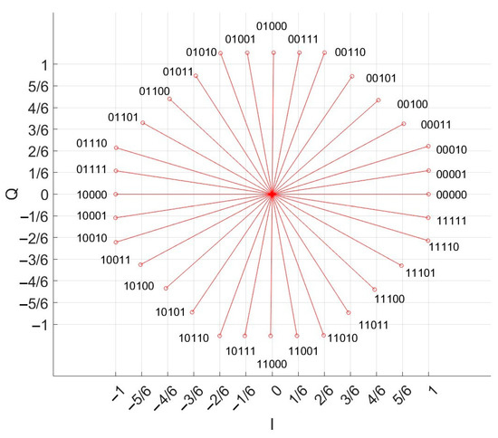 Constellation diagram of the different phase steps from 0° (00000) to 348.75° (11111), in steps of 11.25°, at the center frequency, 19.5 GHz.