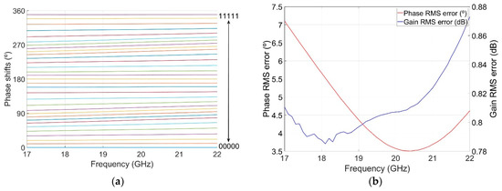 These phase shifts were verified in a frequency range from 17 GHz to 22 GHz, and the results can be seen in Figure 7 for the RMS gain and phase error in this frequency range. It can be seen how the phase steps are maintained in the whole frequency range with a phase RMS error lower than 7° and a gain RMS error lower than 0.90 dB. Having a resolution of 5 bits means that we can tolerate an RMS phase error lower than 5.6° (half of the phase step). That happens for frequencies higher than 18 GHz.