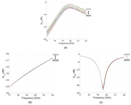 The input and output impedance adaptation to 50 Ω were evaluated by using the S-parameters. The obtained results for parameters S21, S11 and S22 are summarized in Figure 8. The reflection coefficient, S11, is lower than −10 dB in the whole frequency range, resulting in a good input impedance matching. For S22, the result is lower than −8 dB from 17 GHz to 22 GHz. It can be seen that the power gain has a maximum of −6 dB at the work frequency, with an RMS maximum error of 0.78 dB. As the main performance of this work was to obtain the desired phase shifts with a low RMS error (less than 50% of the phase step), we prioritized this to have a high gain. With the proposed topology, we saw that when we were looking for a higher gain, the RMS phase error increased too. In this work, we tested our idea in the frequency band from 17 GHz to 22 GHz. In order to improve the S22 result, the output matching network must be adjusted to the specific frequency band for the desired application. In this work, we adjusted it to the central frequency, 19.5 GHz. This is the reason why, at the lower and higher frequencies of the tested band, the return losses increase.