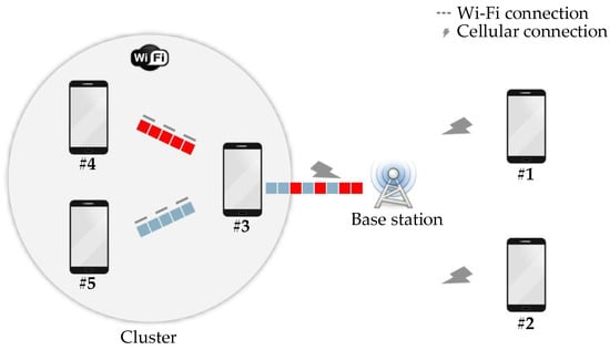 The DRONEE [] method utilizes a cluster-based approach to group users together with each cluster appointing a cluster head that improves energy efficiency and optimizes the utilization of LTE cellular networks. The cluster head is responsible for communicating with the evolved eNB. The eNB is an LTE terminology referring to the LTE cellular network infrastructure that is commonly known as a base station. This cluster head ensures efficient data transmission and network access for all members within the cluster. Users are connected through an energy efficient secondary wireless interface, such as Wi-Fi networks. The cluster head is responsible for high power consumption LTE communication with the base station [,]. DRONEE method’s cluster-based formation enables lower power consumption and contributes to an overall improvement in energy efficiency. This is because the DRONEE method’s cluster head selection process is determined on a per-frame basis. Therefore, its scheduling strategy is channel-opportunistic. This paper focuses on improving the DRONEE–W method, which utilizes the WRR scheduling method. The architecture of the DRONEE method is illustrated in Figure 1.
