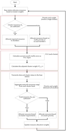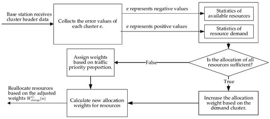 When we determine the sum of available idle resource traffic  and required resource flow  through Equations (9) and (10), respectively, we can readjust the allocation of resource flow from the base station to the cluster head. If  is greater than , the currently idle network traffic is sufficient for the clusters that require network traffic. However, if  is less than , it indicates that the current network traffic cannot allocate enough resources to the clusters requiring traffic adequately. In such cases, adjustments must be made to allocate network traffic appropriately in terms of need for the clusters.