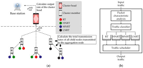The child node sends a packet queue (a) Schematic diagram of the traffic transfer model; (b) Packet classification queue model for each node.