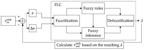 Figure 6 illustrates the block diagram of the DRONEE–WPRC rate controller, which incorporates the FLC and WPRC algorithm. In the introduced FLC model, there are two input values and one output value. The input values, error () and error variation (), represent the difference between the input transmission rate  and the output transmission rate . The output value  serves as the weight parameter.