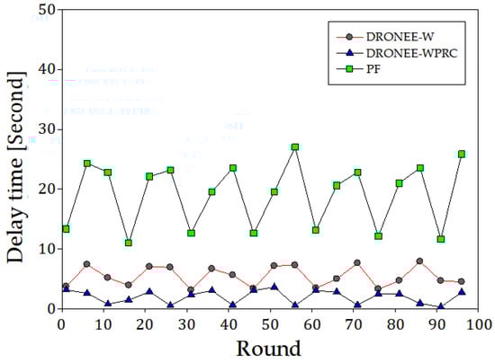 Figure 14 illustrates the delay time results for the scenario where the three groups of users were evenly distributed. Simulation results indicate that the overall average of delay time for DRONEE–WPRC, DRONEE–W, and PF methods were 2.07 s, 5.84 s, and 19.88 s, respectively. The clustering architecture employed by the DRONEE–WPRC and DRONEE–W methods improves the total throughput compared to the PF method. Furthermore, the adoption of the FLC algorithm and QoS scheduling methods in our proposed DRONEE–WPRC method allows for better utilization of the network resources. This leads to a reduced buffer size and a corresponding reduction in delay time for users. As a result, the delay time of our proposed method surpasses that of the DRONEE–W method and PF method.