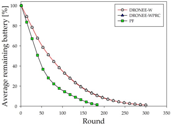 Figure 15 illustrates the average remaining battery results in a scenario where three groups of users were evenly distributed. The simulation result indicates that the number of rounds until the battery depleted for the DRONEE–WPRC, DRONEE–W, and PF methods were 310, 309, and 193, respectively. The clustering architecture employed by the DRONEE–WPRC and DRONEE–W methods leverages the lower power consumption of the Wi-Fi network. As a result, users can utilize less power while efficiently meeting their network requirements.