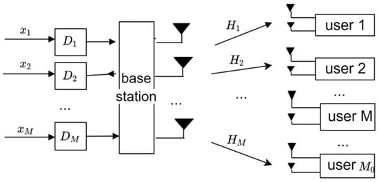 This paper takes the downlink of a multi-user massive MIMO system as the background, assuming that the base station has transmitting antennas and users, and if the number of receiving antennas for the mth user is , the base station can support M users to communicate at the same time in each scheduling time slot. The system model is shown in Figure 1.
