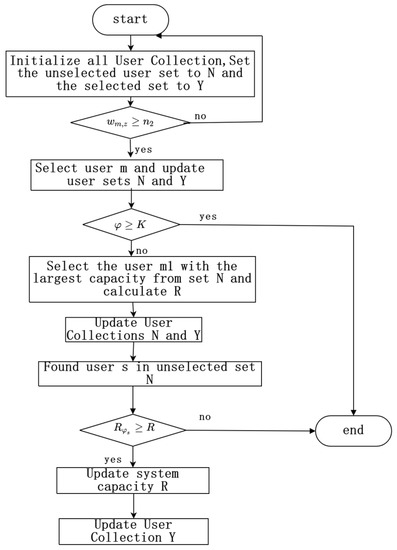 - Step 4: Iterate through the remaining user collection N. For each user s in N, define and calculate the capacity of set : . In set N, if a user satisfies , let at this time. Otherwise, end the algorithm and then update and update user collection , .