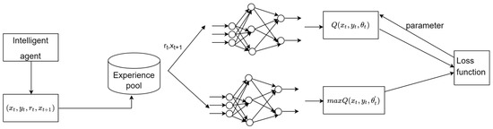 The solution model based on DQN is as Figure 4, after each action selection, the intelligent agent will store the state, action, rewards obtained, and the state of the next time in the experience pool. When the experience pool is full, the network starts to update. The reward and the next moment’s state are used to calculate the Q value, and the target Q value is calculated from the Q value, and then the loss function value is calculated until convergence.