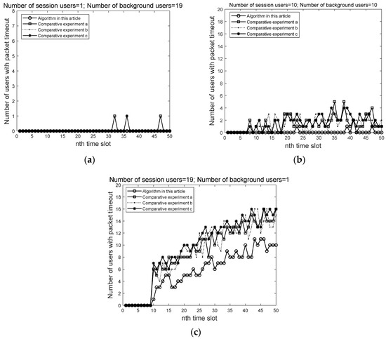 Comparison of data packet timeouts of different algorithms. (a) Packet timeout when the number of session users is 1 and background users are 19; (b) Packet timeout when the number of session users is 10 and background users are 10; (c) Packet timeout when the number of session users is 19 and the background user is 1.