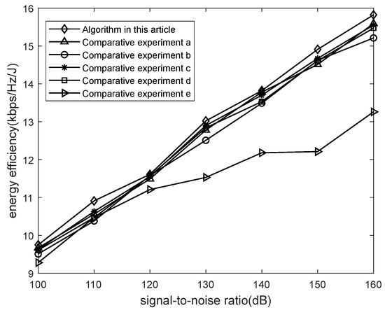 From Figure 6, it can be seen that as the signal-to-noise ratio (SNR) continues to increase, the energy efficiency of all algorithms increases accordingly. It should be noted that the energy efficiency of algorithm e starts to slowly increase after increasing to a certain extent. This is because the algorithm aims to improve system throughput, resulting in higher energy consumption and having advantages in optimizing throughput alone. From the graph, it can also be observed that the algorithm proposed in this article and the comparison algorithms a, b, c, and d have a similar growth rate as the signal-to-noise ratio increases. This is because these algorithms are all optimized based on energy efficiency. However, compared to this, the method proposed in this article still has a slight advantage, indicating that the algorithm proposed in this article can improve throughput while not affecting energy efficiency.