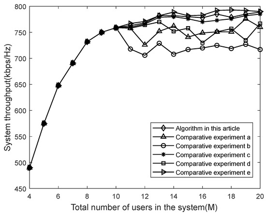In order to further verify the advantages of the algorithm proposed in this article in terms of system capacity compared to other algorithms mentioned above, different algorithms were compared as the number of users in the system continued to increase, as shown in Figure 7.