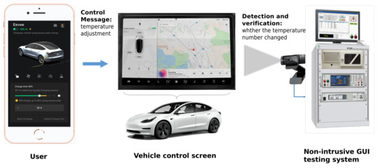 On the other hand, non-intrusive testing refers to the testing conducted without directly modifying or touching the central control hardware and software [15]. It does not rely on hardware interfaces and employs cameras to capture images of the vehicle’s center control screen for evaluation. RoScript [16] employs visual testing scripts to articulate GUI operations on touchscreen applications, subsequently utilizing physical robots to drive the automation of test execution. NiCro [17] incorporates the most advanced GUI widget detectors to identify widgets from GUI images, subsequently analyzing a composite set of information to match widgets across different devices. During the actual development of the IoV App, particularly at stages close to delivery, car manufacturers always block vehicle center control screen hardware module interfaces to ensure system stability, resulting in the exclusive use of non-intrusive methods for GUI testing. Figure 1 presents the non-intrusive GUI testing process for IoV apps.