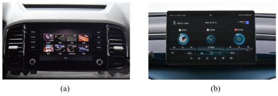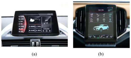 Figure 2. In-car control screens with various sizes. (a) 6–8 and (b) 11–13 inch screens. - Various screen shapes: Square screens, typically designed with a 4:3 or 16:9 aspect ratio, are commonplace, displaying an array of information and user interfaces. Rectangular screens are lengthier, often featuring a 21:9 aspect ratio, while trapezoidal screens innovate with differing angles at the top and bottom, adapting more effectively to the shape and position of the central control panel. Circular screens are uniquely employed in some high-end vehicle designs, providing drivers with a distinctive visual experience. As square and rectangular screens prevail within the market and circular and trapezoidal screens are typically found in high-end vehicles with a smaller market share, data collection should prioritize square and rectangular screens. Figure 3 illustrates the screen in various shapes.