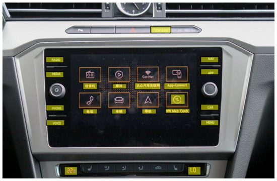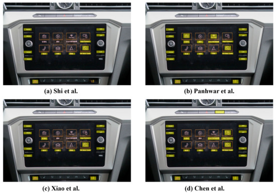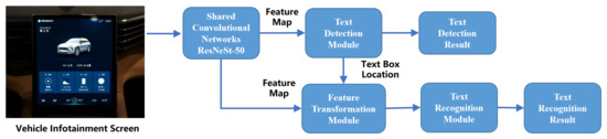 Currently, most neural network-based techniques divide this functionality into two components: text detection and text recognition [28,29]. Text detection accurately locates textual areas on the screen, typically employing bounding boxes for annotation, while excluding interfering factors such as distortion and noise [30]. Text detection technology is closely associated with generic object detection technology, and with the progression of deep learning techniques, utilizing convolutional neural networks (CNNs) and recurrent neural networks (RNNs) for in-car central control display text detection has become increasingly prevalent [31]. Neural network technology learns textual region features autonomously through training on copious annotated data [32], thereby accurately detecting and extracting textual information. However, to enhance detection performance and stability, optimization and adjustments are still required with respect to specific vehicle models, screen sizes, and lighting conditions [33,34].