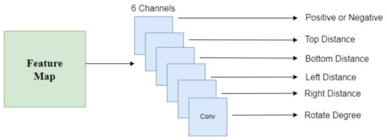 Figure 5 illustrates the composition of the text detection branch, which comprises multiple convolutional neural network layers. Initially, a convolutional layer computes the probability of each pixel functioning as a positive sample. Subsequently, for every pixel that qualifies as a positive sample, quadruple channel predictions are initiated to estimate the distances to the top, bottom, left, and right boundaries of the predicted bounding box. Ultimately, a specific channel is tasked with predicting the orientation of the associated bounding box.