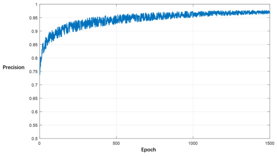 The gradient descent algorithm is used here to optimize the network model, so the change in loss value during the training process is not smooth. As can be seen from Figure 8 and Figure 9, with the increase in iterations, the network loss value gradually decreases and eventually stabilizes at a constant value. At the same time, the classification accuracy also increases with the increase in iterations. After about 2000 iterations, the classification accuracy finally stabilizes at around 0.95.