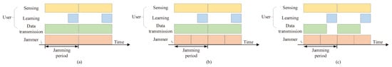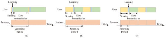 QL anti-jamming communication timeslot structure diagram. (a) Sensing and learning timeslot is very short; (b) The timeslot of sensing and learning is comparable to the transmission timeslot; (c) The jamming changes rapidly.