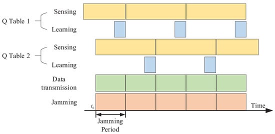 As shown in Figure 2a, QL anti-jamming communication considers spectrum sensing, learning, and data transmission as a serial process. At the same time, it is considered that the sensing and learning timeslots are very short and almost negligible. Then, according to Equation (1), the timeslot utilization is only related to the jamming collision rate [1].