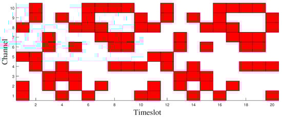 This section conducts anti-jamming research for intelligent blocking jamming. The basic idea of intelligent blocking jamming is that the jammer chooses the four channels with the highest communication frequency to jam through the communication frequency of each channel in each timeslot for a period of time. The simplified slot-channel diagram of jamming channel in a period is as Figure 5 [16,17].