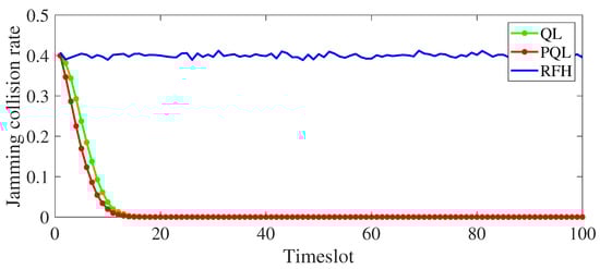 Figure 6 shows the comparison between PQL, QL and RFH algorithms in terms of jamming collision rate. In the simulation, the sum of the sensing and learning timeslot lengths is equal to the transmission timeslot length and the jamming timeslot length. It can be seen from the figure that when the algorithm converges, the jamming collision rate of both QL and PQL can be reduced to 0 after the algorithm converges, indicating that for the jamming with slow jamming change speed, both algorithms can effectively learn the jamming strategy and make the correct channel selection action. However, the random frequency hopping strategy randomly selects communication channels in each timeslot, and for each timeslot, 4 channels out of 10 must be jammed, so the jamming collision rate is 0.4.