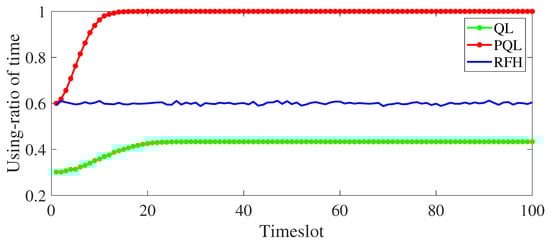 Figure 7 shows the comparison of timeslot utilization between PQL, QL and RFH algorithms when sensing and learning timeslots are short. QL adopts a serial structure to model the sensing, learning, and transmission timeslots, where the length of each timeslot is set to ms, ms, and can be calculated. According to Equation (2), the timeslot utilization is. Therefore, constrained by the structure itself, the maximum timeslot utilization of QL is 1/2. It can also be seen from the figure that when the algorithm converges, the timeslot utilization of QL is 0.5, which is consistent with the theoretical results. PQL models the sensing, learning and transmission timeslots into a parallel structure. When the jamming collision rate is reduced to 0, the slot utilization can reach 100%.