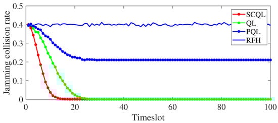Figure 8 shows the comparison of timeslot utilization of four algorithms, namely, QL, PQL, SCQL and RFH, in combating intelligent blocking jamming. In the simulation, the sum of the sensing and learning timeslot lengths is twice as long as the transmission timeslot length and the jamming timeslot length, as shown in Figure 8. From the simulation results, we can see that when the algorithm converges, the jamming collision rate of the random frequency hopping strategy is 0.4, and the reason is the same as the previous analysis. The jamming collision rate of PQL is about 0.22. The reason is that the jamming channel changes too fast, and the PQL algorithm experiences the jamming of two timeslots in each transmission timeslot (as shown in Figure 3), but the PQL algorithm only learns the jamming of the former timeslot effectively, which leads to the loss of jamming information of the latter timeslot. It also leads to the increase of jamming collision rate. Because of the serial structure of QL, the communication is stopped whenever the jamming changes, and the communication is carried out on the new channel after the effective learning of the new jamming information, so that the jamming in each sensing and learning timeslot is effectively avoided, so that the jamming collision rate is reduced to 0. The SCQL algorithm establishes multiple Q-tables, and different Q-tables record the jamming encountered in the same sensing and learning timeslot in different jamming timeslots. Thus, each jamming timeslot is effectively learned, so that the jamming collision rate is reduced to 0.