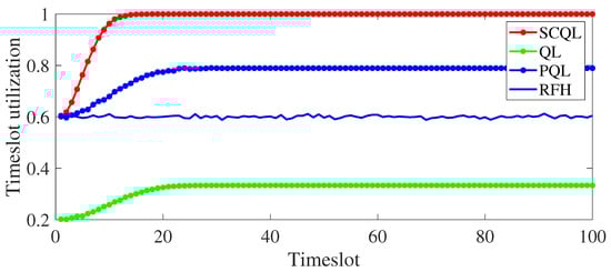 Figure 9 shows the comparison of timeslot utilization of four algorithms, namely traditional QL, PQL, SCQL and RFH, in combating intelligent blocking jamming. Among them, the length of each timeslot is set to, which can be calculated. QL adopts a serial structure to model the sensing, learning, and transmission timeslots. According to Equation (2), the timeslot utilization is. Therefore, limited by the structure itself, the maximum timeslot utilization of QL is 1/3. Due to the PQL model of sensing, learning, and transmission timeslots into a parallel structure, the timeslot utilization has been improved to a certain extent. However, due to the high jamming collision rate, the timeslot utilization can only reach about 78%. By using multiple Q-tables to learn the jamming of different jamming timeslots in the same sensing and learning timeslot, the jamming collision rate is effectively reduced. In addition, the sensing and learning timeslot and the transmission timeslot are parallel and carried out at the same time, so the slot utilization can reach 100%.