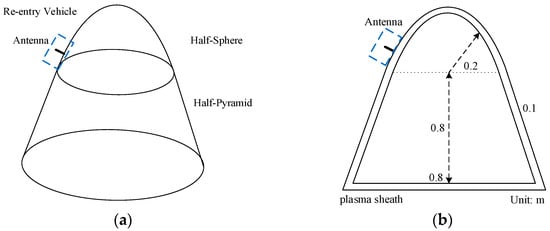 The plasma sheath can be expressed by the anisotropic plasma. The parameters of the plasma sheath can be simulated by the RAM-C based on the Computational Fluid Dynamics method as []. According to the same approach, the parameters under the condition of 80 km height in the atmosphere with a speed of 25 Ma. The temperature and the pressure of the atmosphere are 247.0 K and 30.0 Pa. A high temperature of 1700 K is formed due to the conversion of kinetic energy to thermal and chemical energy across a strong shock wave at the hypersonic speed. The plasma sheath is with the parameters and thickness of GHz, GHz, GHz, and 0.1 m. On the surface of the re-entry vehicle, the monopole antenna is located along the normal vertical direction. The vehicle is made up of metal which can be expressed by the perfect electronic conductor (PEC) during the simulation.
