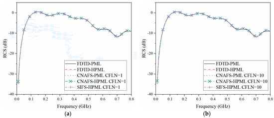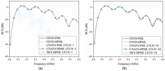 As can be concluded from Figure 4a and Figure 5a that the curves are almost overlapped with CFLN = 1. Such a condition indicates that the algorithms hold the same calculation accuracy with a small time step. In addition, such a condition also indicates that the calculation of anisotropic magnetized plasma is efficient. From Figure 4b and Figure 5b, curves show some shifting compared with the explicit FDTD-PML and FDTD-HPML schemes. Such a condition is caused by the enlargement of numerical dispersion with the enlargement of the time step. However, the calculation accuracy still shows a considerable level. As can be compared and observed between Figure 4 and Figure 5, the existence of the plasma sheath significantly affects the target characteristic. Nowadays, the communication system between the vehicle and the ground depends on the VHF and UHF band. The variation of scattering waves shows an influence on the detection. The effectiveness of the algorithm can be reflected by the memory consumption, simulation duration, and time reduction obtained by different algorithms and CFLN, as shown in Table 1.