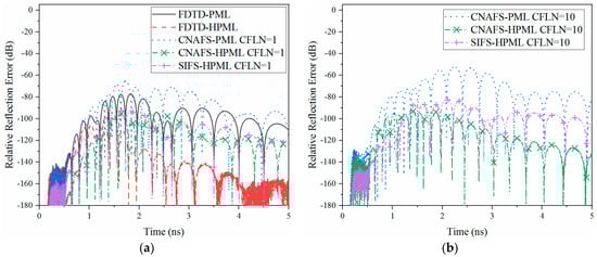 As shown in Figure 7a that the conventional explicit FDTD-HPML scheme holds the best performance due to the employment of higher-order formulation and explicit calculation procedure. With the employment of an implicit scheme, absorption decreases with the introduction of matrices at each time step. Among the implicit schemes, the proposed scheme almost holds the same performance compared with the original CNAFS-HPML scheme. Compared with the original CNAFS-PML and FDTD-PML schemes, absorption can be increased significantly. It can be concluded that the employment of higher-order formulation improves absorption, especially in late-time reflections. As shown in Figure 7b that the absorption decreases with the enlargement of time steps. The reason is that numerical dispersion increases in such circumstances resulting in a decrement in calculation accuracy and absorption. Meanwhile, it can be concluded that the proposed scheme still shows a similar performance compared with the original CNAFS-HPML scheme. Compared with the FDTD-PML, absorption still can be improved with larger time steps. The effectiveness of the calculation can also be reflected by the memory consumption, simulation duration, and time reduction obtained by different algorithms and CFLN which are shown in Table 2. As shown in Table 2, the explicit FDTD-PML and FDTD-HPML schemes hold the best calculation efficiency due to the free matrix form during the iteration. The implicit schemes including CNAFS and SIFS algorithms solve matrices at each time step resulting in the calculation being much more expensive from the aspects of memory consumption and simulation duration. Meanwhile, according to the higher-order formulation, memory consumption, and simulation duration also increase by multiplying stretched coordinate variables together into a single form. The simulation duration can be decreased by employing a larger CFLN to enlarge the simulation time step. It can be observed that the simulation duration can be further decreased with CFLN = 10. Meanwhile, compared with the CNAFS algorithm, the proposed SIFS algorithm can avoid repeated calculation of auxiliary variables, field components, and coefficients resulting in a decrement in simulation duration and memory storage.