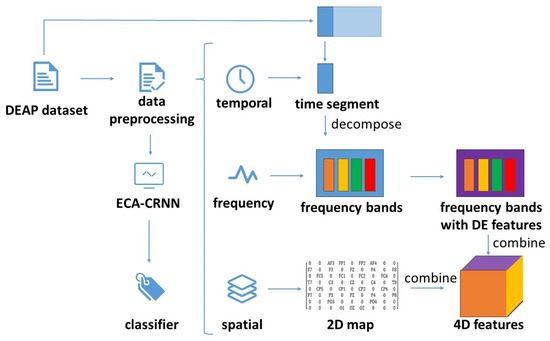 In order to extract the different features easily and accurately, it was necessary to preprocess the original DEAP dataset first. Considering that the DEAP dataset had been sampled in advance, band pass filtering within a range of 4–50 Hz could be applied to eliminate delta waves as well as the industrial frequency spurious noise. The initial step involved segmenting the signal into fixed temporal segments of a specific size, t. Subsequently, the data were partitioned into four frequency bands using a Butterworth filter. Then the differential DE features were extracted from each frequency band with a sampling time of 0.5 s [39,40], which yielded relatively superior results. Finally, the spatial information was integrated with the aforementioned features to generate the 4D feature. This operation ensured that the preprocessing data were resized from (40, 40, 8064) to (4800, 4, 8, 9). Among it, 4800 represents 40 one-minute videos with a sampling time of 0.5 s, four represents four frequency bands and (8, 9) represents the spatial information.