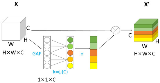 However, in practical applications of SE-Net, it has been observed that some significant information would be lost during the process of squeeze and capturing dependencies between all channels could be inefficient and unnecessary. To address this issue, ECA-Net is proposed. ECA-Net [32] is a lightweight attention-mechanism module that is developed from SE-Net. It was released at CVPR in 2020. It is characterized by easy plug and apply. Unlike traditional methods that assign weights to each channel based on their importance, ECA-Net utilizes a fully connected layer to achieve local cross-channel interaction within a fixed range. This method reduces computation and enhances the portability and efficiency of the structure. The schematic diagram of ECA-Net is shown in Figure 4: