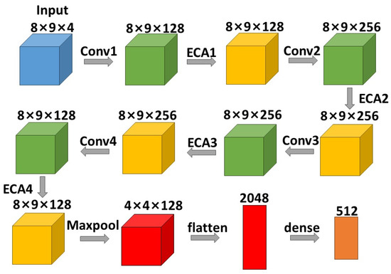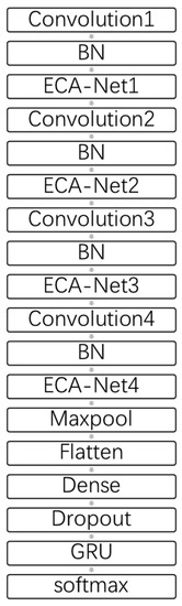 The ECA-Net module was inserted after each convolutional layer, respectively, to ensure that the corresponding relationship between frequency bands could be better represented. The number of ECA-Net module followed that of convolutions. Because ECA-Net is a channel attention mechanism that generates channel weights, only after convolutions did spatial size become fixed, which did not affect the weights between channels, allowing for more comprehensive feature extraction. The structure of the convolutional neural network presented in this paper is shown in Figure 5: