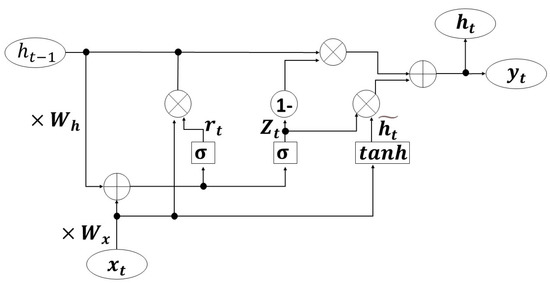 After applying CNN, the time sequence forecasting method should be considered for extracting temporal information. RNN possesses both internal feedback connections and feedforward connections between processing units, as well as the ability to memorize like a human. However, its susceptibility to short-term memory may compromise its performance. When dealing with long sequences, it becomes challenging for information to propagate from earlier time steps to later ones, leading to issues with gradient vanishing or exploding. GRU is an improvement of RNN that could effectively address this issue, while also resolving the problem of long-term dependencies [37]. The basic diagram of GRU is shown in Figure 6: