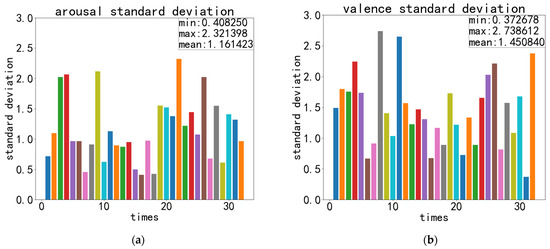 Recordings of ECA-CRNN’s best recognition standard deviation on DEAP: (a) standard deviation of arousal; (b) standard deviation of valence.
