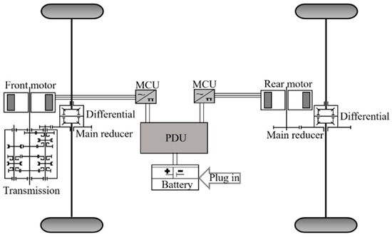 A dual-motor four-drive electric powertrain is studied in this paper, and its architecture is shown in Figure 1. The key components consist of the front motor, a 6-speed automated mechanical transmission, the front-axle main reducer and differential, the power battery and plug-in charging port, a power distribution unit (PDU), two motor control units (MCUs), the rear motor, and the rear-axle main reducer and differential. In detail, the front motor is a permanent magnet synchronous motor (PMSM) with a peak power of 105.4 kW, and its power is transmitted to the vehicle via the transmission, main reducer, and differential. Another PMSM with a peak power of 45 kW is mounted on the rear axle and can propel the vehicle via the main reducer and differential. The power battery can be charged from the external energy supply through the charging port, and its power is distributed to two MCUs by the PDU.