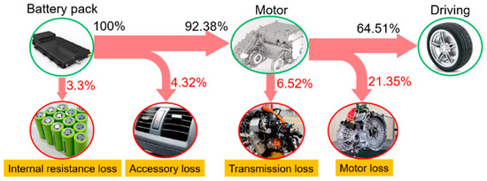 The energy loss analysis is based on the pure electric range experiment data of a “single-motor + transmission” powertrain. The pure electric range experiment was performed according to GB/T 18352.6-2016 in China. As shown in Figure 4, 3.3% of battery energy is lost due to battery internal resistance; 4.32% of battery energy is consumed by low-voltage accessories; approximately 64.51% of the energy is used to propel the vehicle; 6.52% of the battery energy is lost in the transmission; and motor and controller losses account for 21.35%.