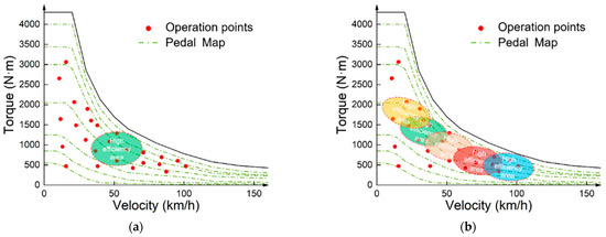 As for the “single motor + main reducer powertrain”, the type and primary parameters of the driving motor are devised based on the vehicle’s dynamic performance index. Therefore, the motor with a high rated power is chosen to satisfy the vehicle’s power requirements, even though it will have a low working efficiency under most conditions. Even if the operation point distribution can be improved through motor economic selection and gear ratio optimization, it is only appropriate for certain working conditions and difficult to adapt to the complex actual working conditions, as shown in Figure 5a.