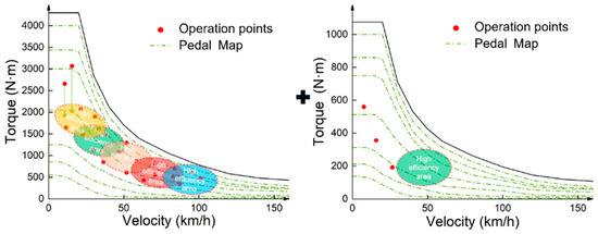 The “single motor + transmission” configuration can adjust motor speed and improve motor operation points through the gear sets. Through the optimization of the gear ratio, more operation points are located in the high-efficiency zone. Its merit is that the freedom of speed control is introduced to change the high-efficiency range of the powertrain, thereby expanding the motor’s high-efficiency operation zone. Nonetheless, this configuration is incapable of adjusting the operation region of the motor torque, and some operation points cannot be located in the high-efficiency zone, as shown in Figure 5b.