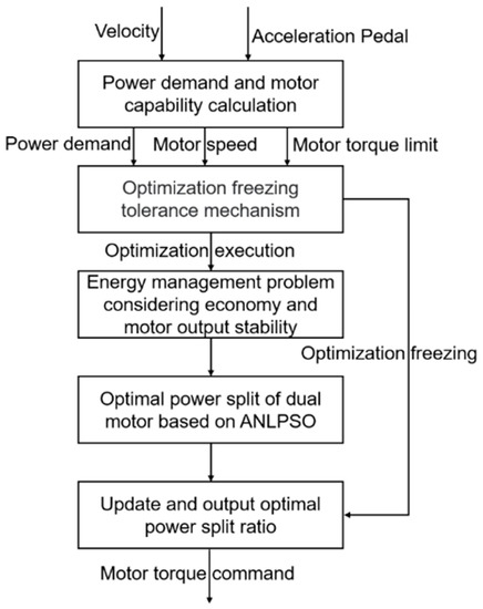 - Second, to improve overall energy efficiency and motor output stability, an ANLPSO is proposed to enhance the optimization performance of PSO by improving the initialization process, inertial weight updating formula, and learning mechanism. In addition, optimization freezing tolerance constraints are introduced to resolve the issue of actual motor response and the balance between optimization performance and real-time performance for the first time, which is crucial to the online implementation of the real-time optimal power distribution for two motors.